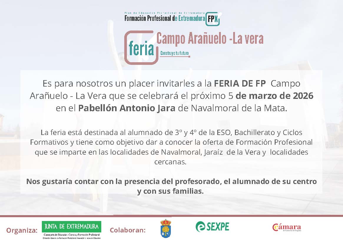 Invitación a la Feria de FP del Campo Arañuelo y La Vera, que se celebrará el próximo jueves 5 de marzo en el Pabellón Polideportivo Antonio Jara de Navalmoral de la Mata. Escrito en 19 de febrero de 2026.